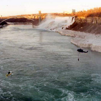 Helicopters in front of the American Falls during filming of the movie "The Long Kiss Goodnight ", Rainbow bridge in background