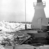 Excessive snow and ice from Lake Ontario push ashore next to Light House at Niagara on the Lake