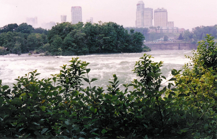 - Skyline of Niagara Falls, Ontario, Brink of the American Falls and Upper Niagara River Rapids