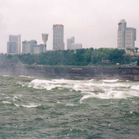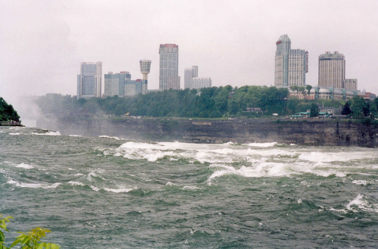 - en-CA Part of the 2004 Snapshot of Niagara Falls project. This photo was taken from the pedestrian bridge between Goat Island and Prospect Point Buildings in the Background: Niagara Fallsview Casino Resort, Konica Minolta Tower, Embassy Suites