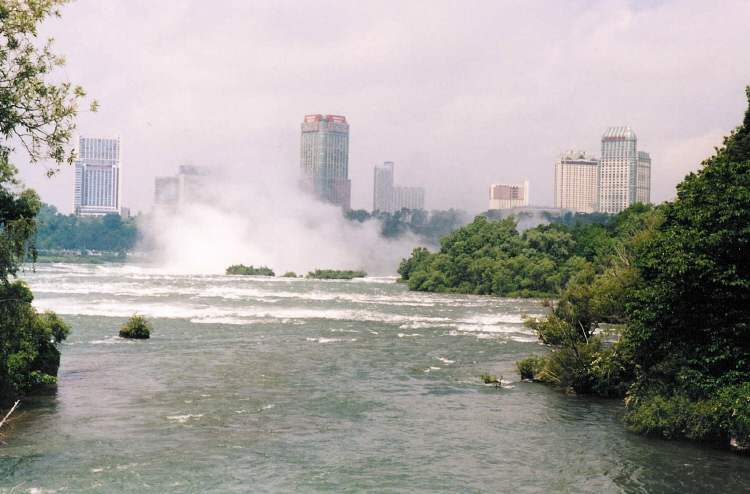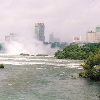 - en-CA Part of the 2004 Snapshot of Niagara Falls project. This photo was taken from the pedestrian bridge between Goat Island & Three Sisters Islands. Buildings in the photo: Embassy Suites, Niagara Fallsview Casino Resort