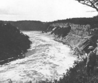 Niagara Falls Heritage Foundation Government of Canada Local Initiatives Grant BK 4701-1 1975 - 1976 ; from a photograph published in Cosmopolitan Magazine and reprinted in "Niagara Daredevils" published 1955 by Karl S Brong ; Research by George Seibel ; In 1901, Maude Willard successfully navigated the Whirlpool Rapids but she suffocated when her barrel which had previously been used by Carlisle Graham, was caught for four hours in the Whirlpool ;