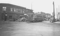 Location is Zimmerman Avenue between Park and Bridge Streets ; Imperial Bank of Canada and H K Rahling Tailor's shop both in background ; note train in extreme background ;