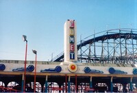 Entrance to the Comet amusement park roller coaster at crystal Beach Ontario The entrance and exits to the Comet are underneath a steel and concrete structure ; art deco style key shapes on the concrete part of structure ; vertical sign reading Comet is in centre ; letters on sign are each in a different colour ; exit and entrance barriers at bottom of image ; part of the coaster is in the background right ; -