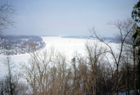 Frozen Niagara River and Gorge Long view of the gorge and river ; very thick ice on the river ; trees in foreground ; -