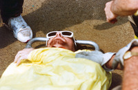 Vehicle travelled on Railway Tracks and is being moved off the tracks after a crash during the test run from Hamilton ; vehicle has Michigan License Plates ;