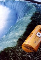 The sandsucker barge Kathryn is shown approaching the old Erie Bell dock in Chippawa Creek ; pleasure boats in the foreground and people at the dock ; an American can be seen flying on a hidden small boat (right) ;