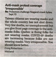 Anti-mask protest coverage 'irresponsible' : Re: Protesters challenge Niagara's mask bylaw Sept 10