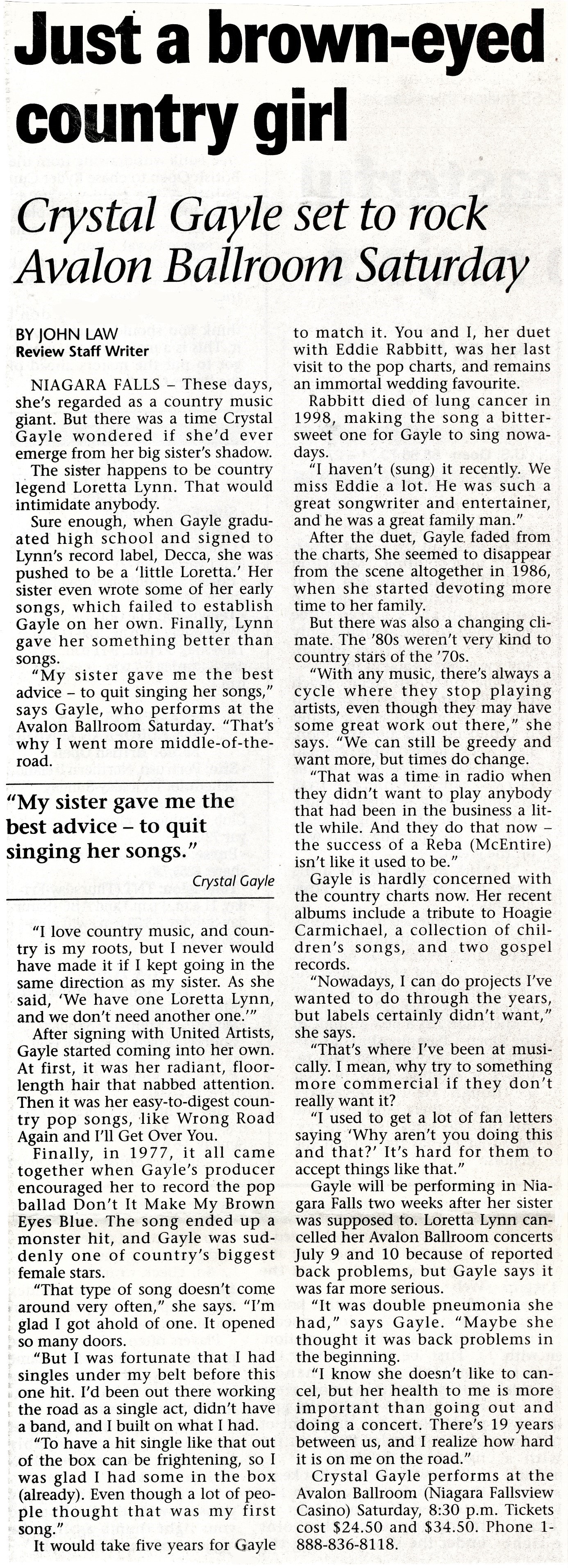 - Just a brown-eyed country girl : Crystal Gayle set to rock Avalon Ballroom Saturday