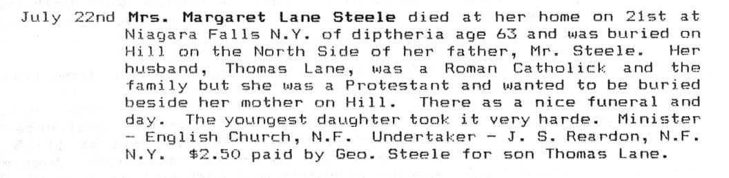 - en-CA July 22, 1899; died July 21st; wife of Thomas Lane
