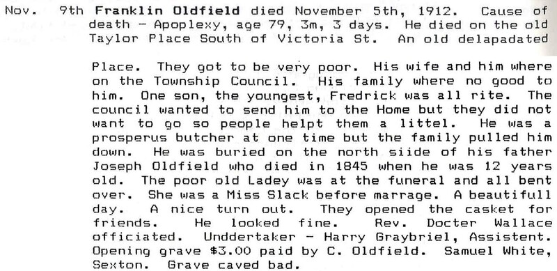 - en-CA Nov 9, 1912; died Nov 5th; butcher; city counselor; son of Joseph Oldfield (died 1845); married with children including youngest son Fredrick; wife: nee Slack