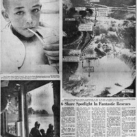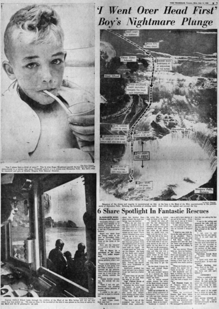 - en-CA Newspaper article from the Toronto Telegram Monday, July 11, 1960 showing the route, a picture of Woodward in the hospital and the Maid of the Mist. Caption reads 'I went over head first' Boy's nightmare plunge