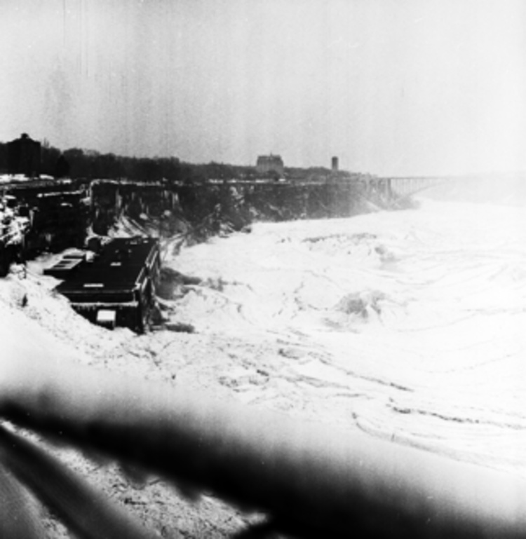 - en-CA Ontario Generating Station in winter surrounded by the ice bridge. Rainbow Bridge can be seen in the background.