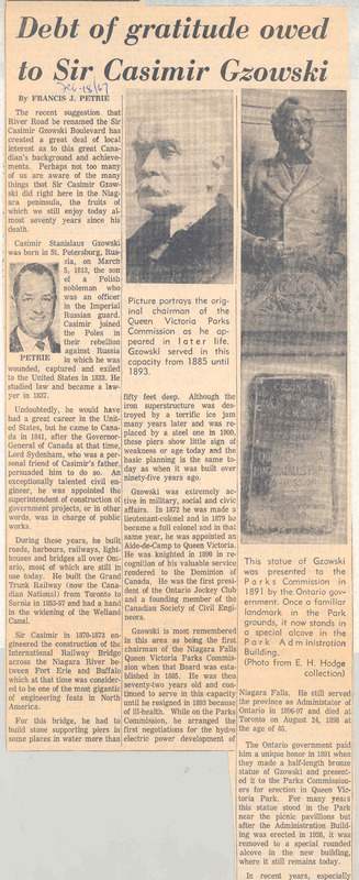 - Debt of gratitude owed to Sir Casimir Gzowski