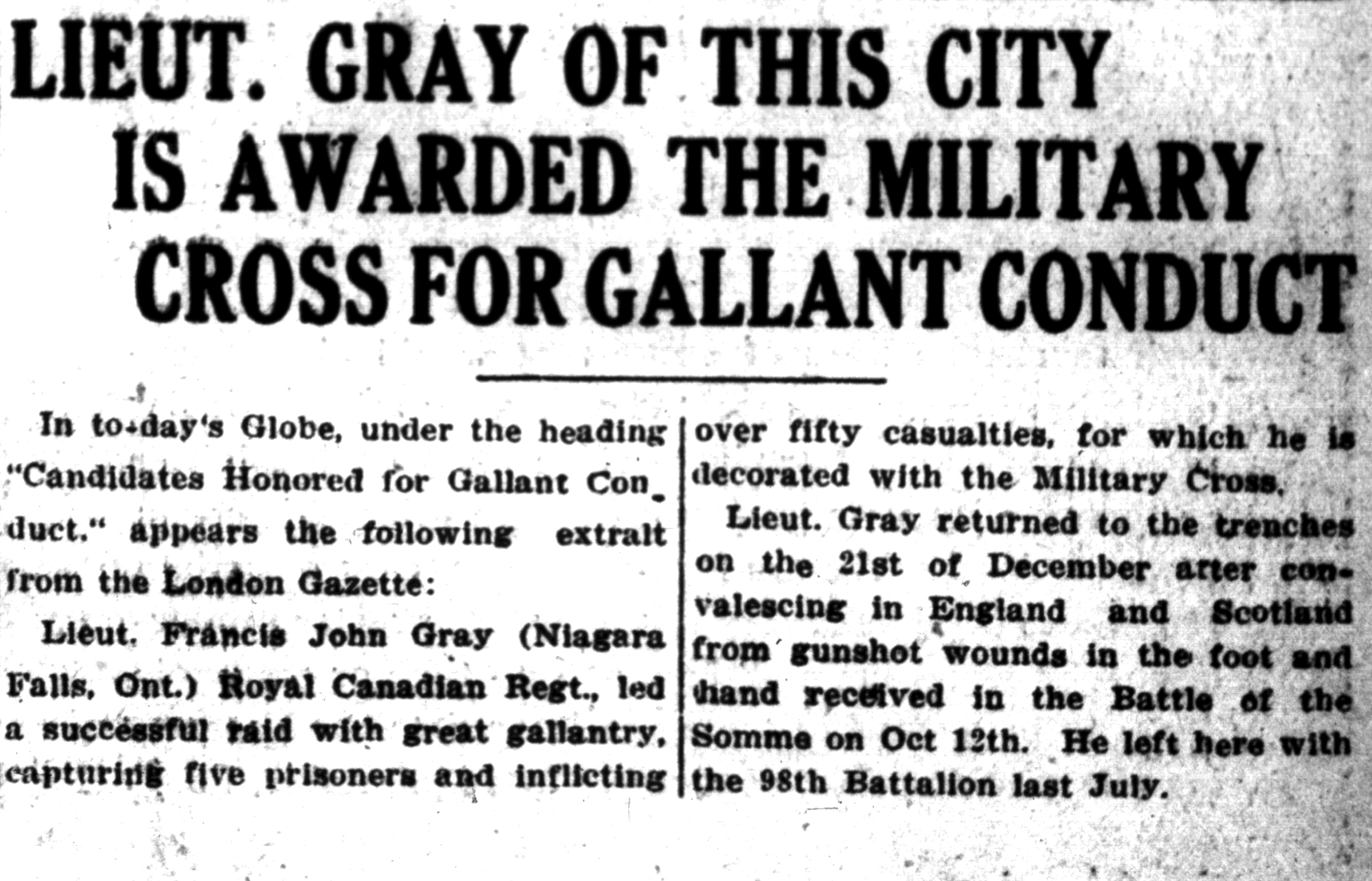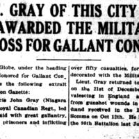 - Lieut. Gray of this city is awarded the Military Cross for gallant conduct
