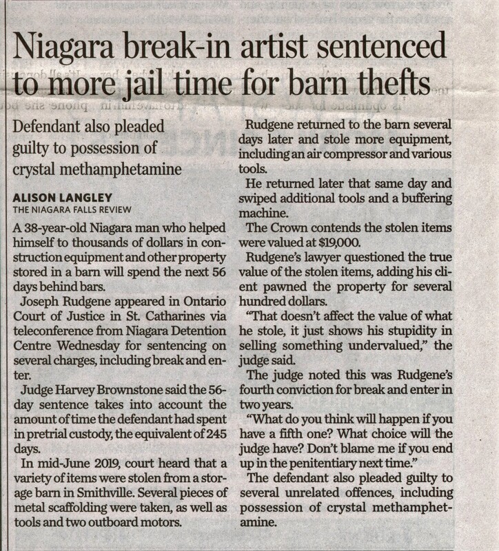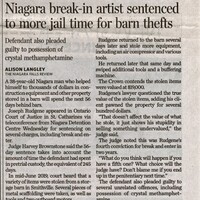 - Niagara break-in artist sentenced to more jail time for barn thefts : defendant also pleaed guilty to possession of crystal methamphetamine