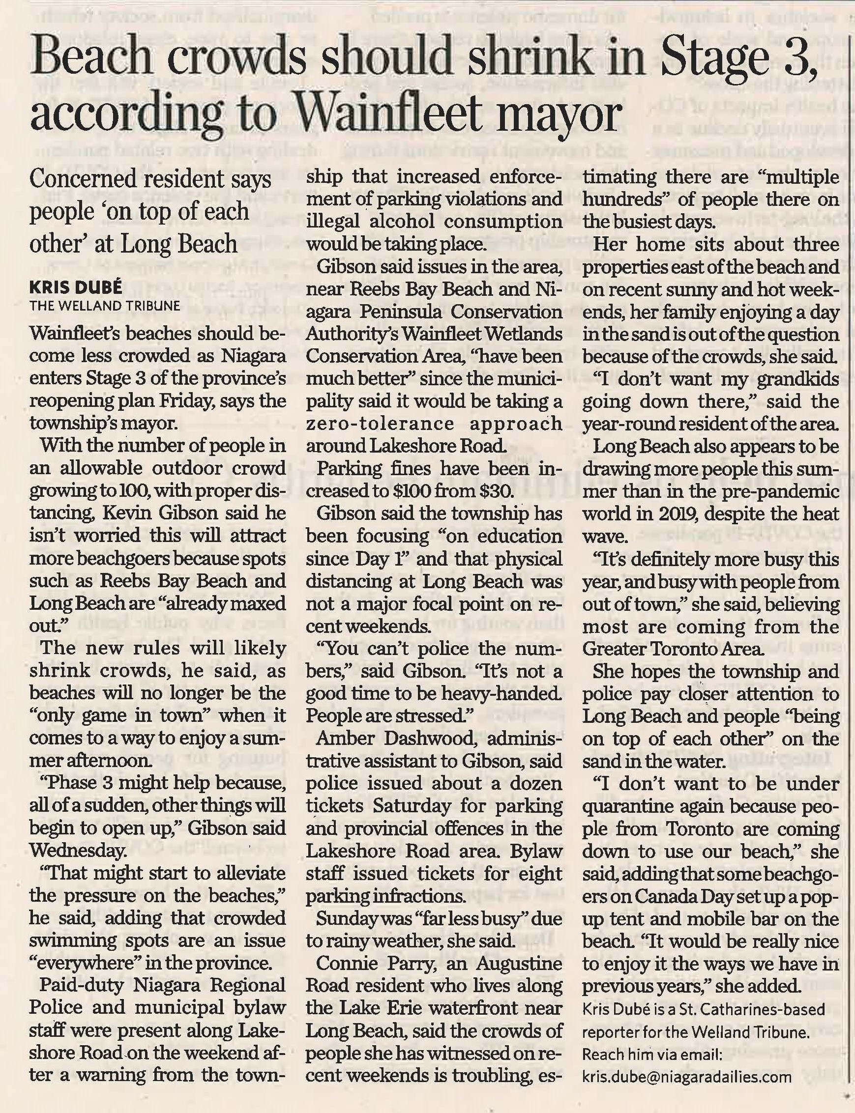 - Beach crowds should shrink in Stage 3, according to Wainfleet mayor