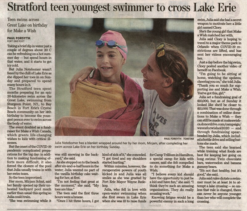 Stratford teen youngest swimmer to cross Lake Erie : Teen swims across Lake on birthday for Make a Wish