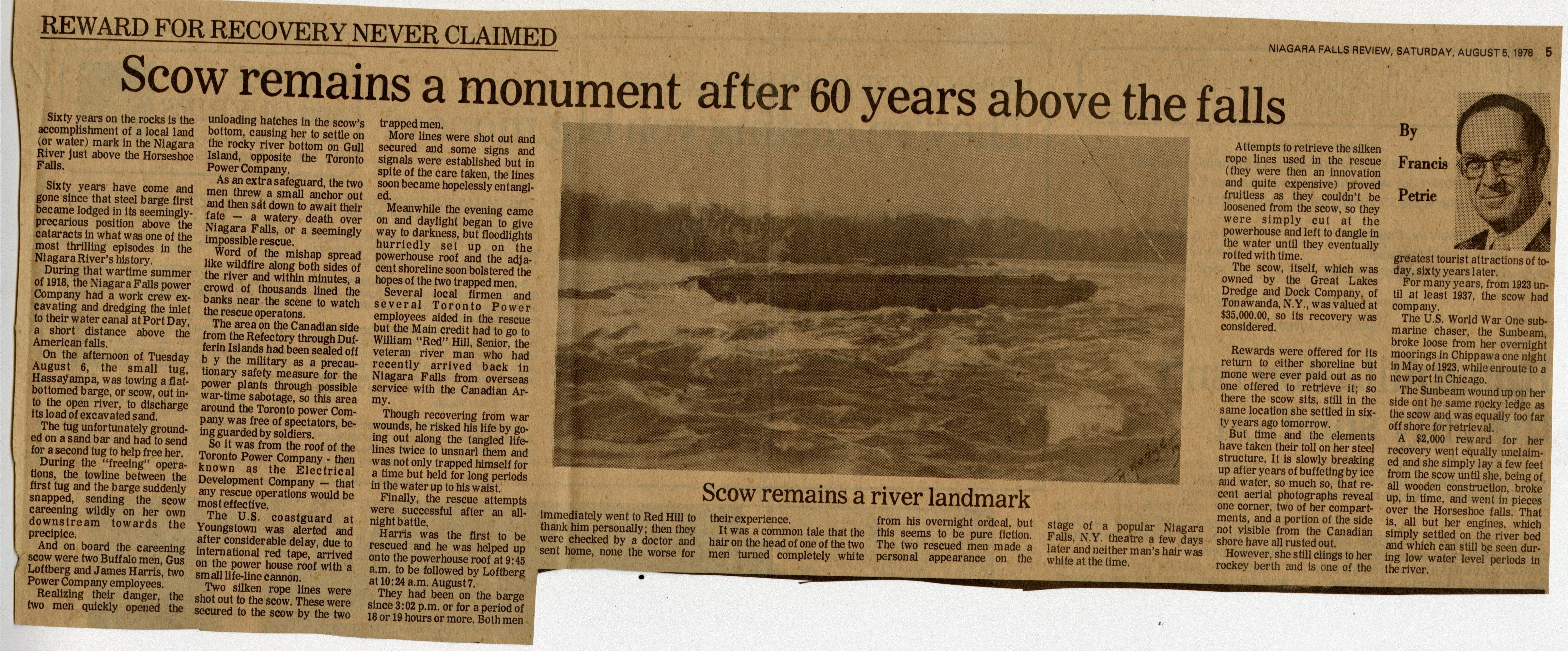- Reward for Recovery Never Claimed : Scow remains a monument after 60 years above the falls