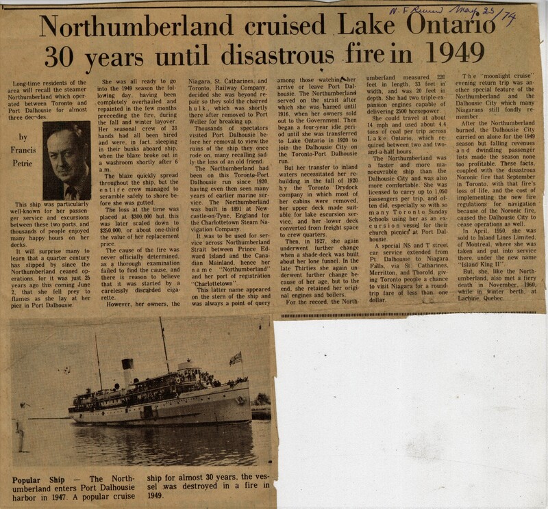 - Northumberland cruised Lake Ontario 30 years until disastrous fire in 1949
