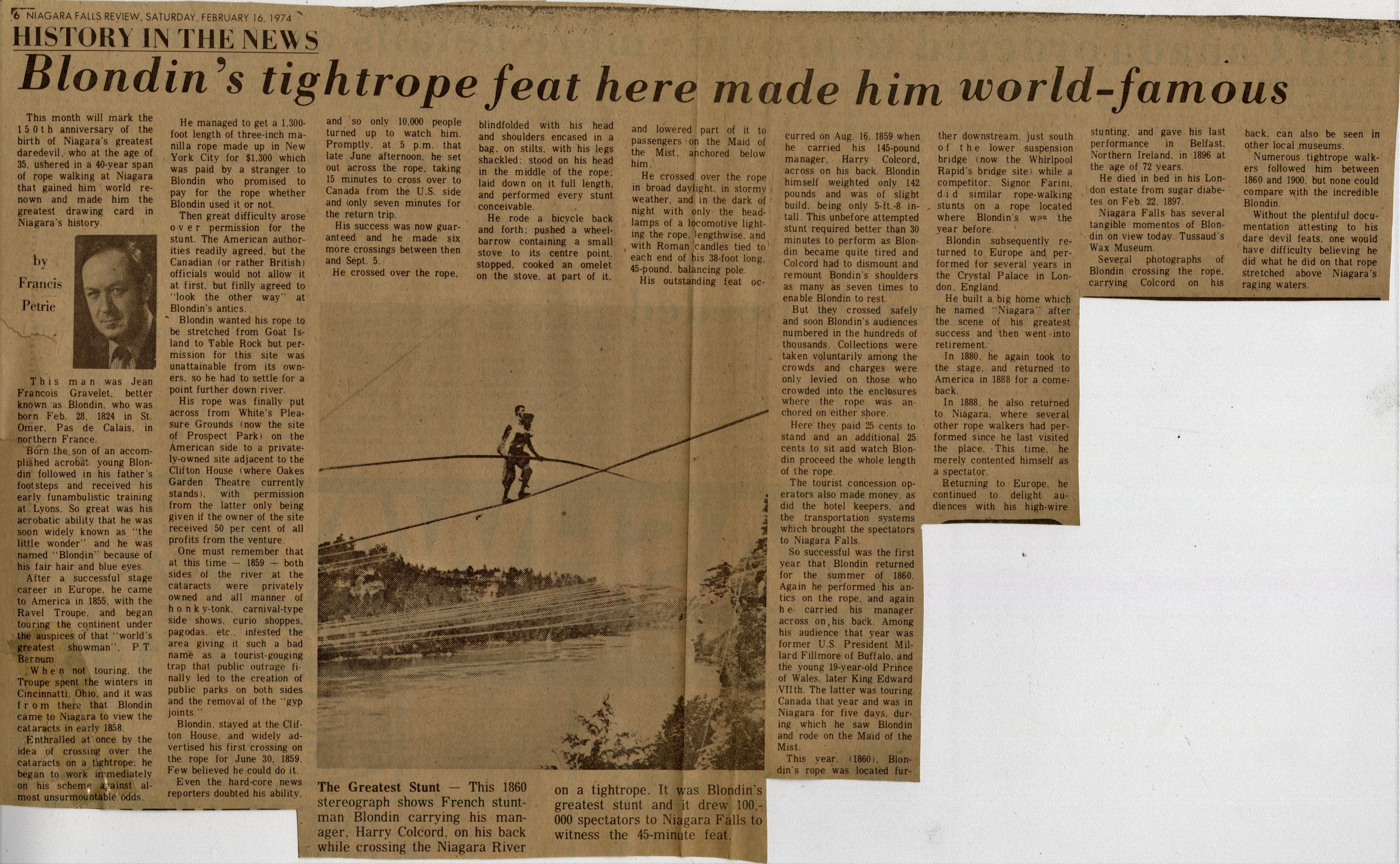 - History in the News : Blondin's tightrope feat here made him world-famous