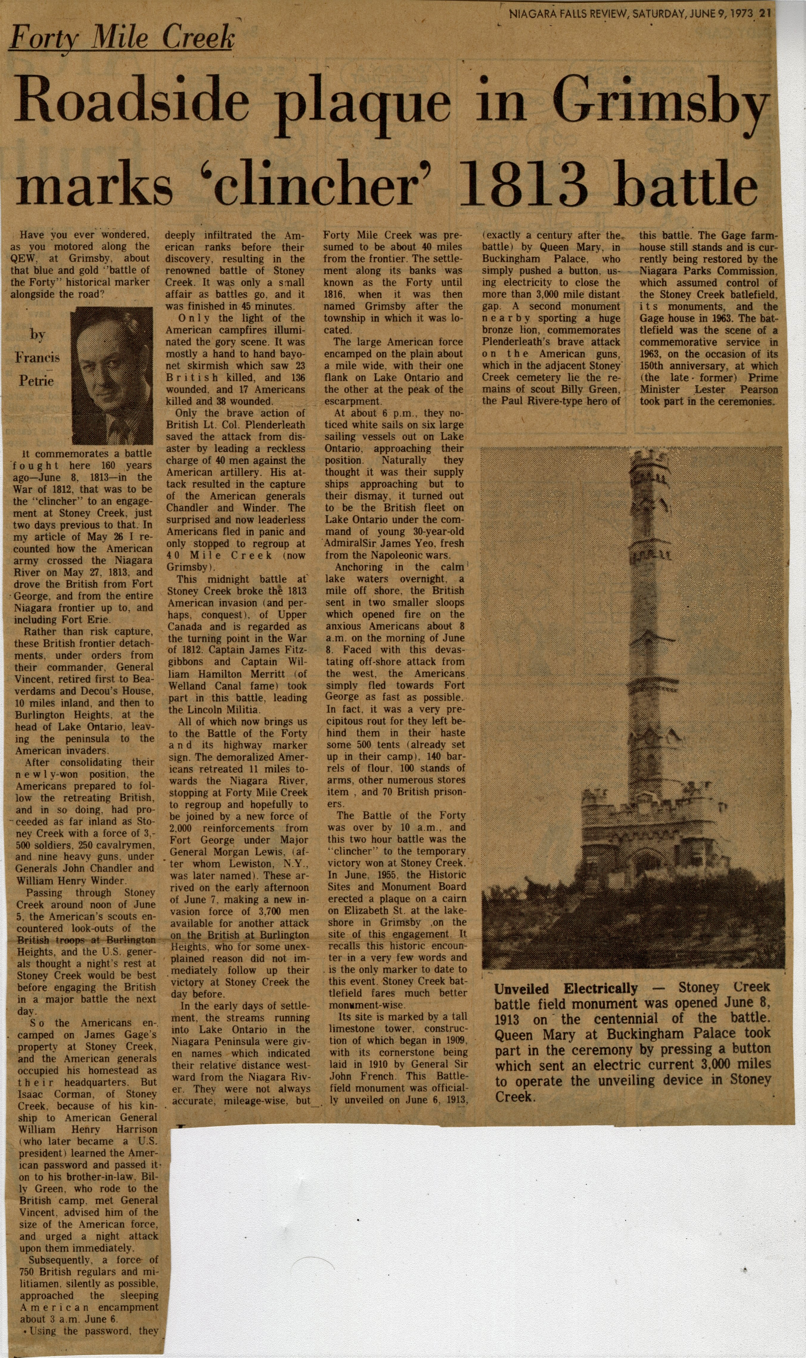 Forty Mile Creek : Roadside plaque in Grimsby marks 'clincher' 1813 battle