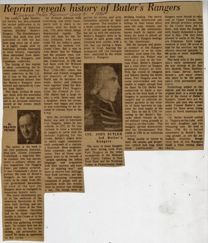 - Reprint reveals history of Butler's Rangers