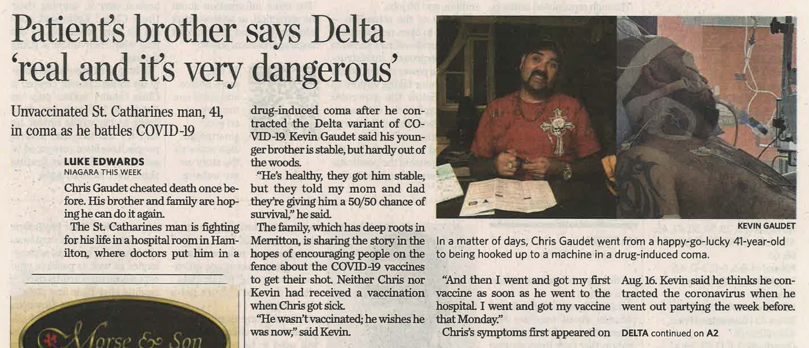 Patient's brother says Delta "real and it's very dangerous" : unvaccinated St. Catharines man, 41, in coma as he battles COVID-19