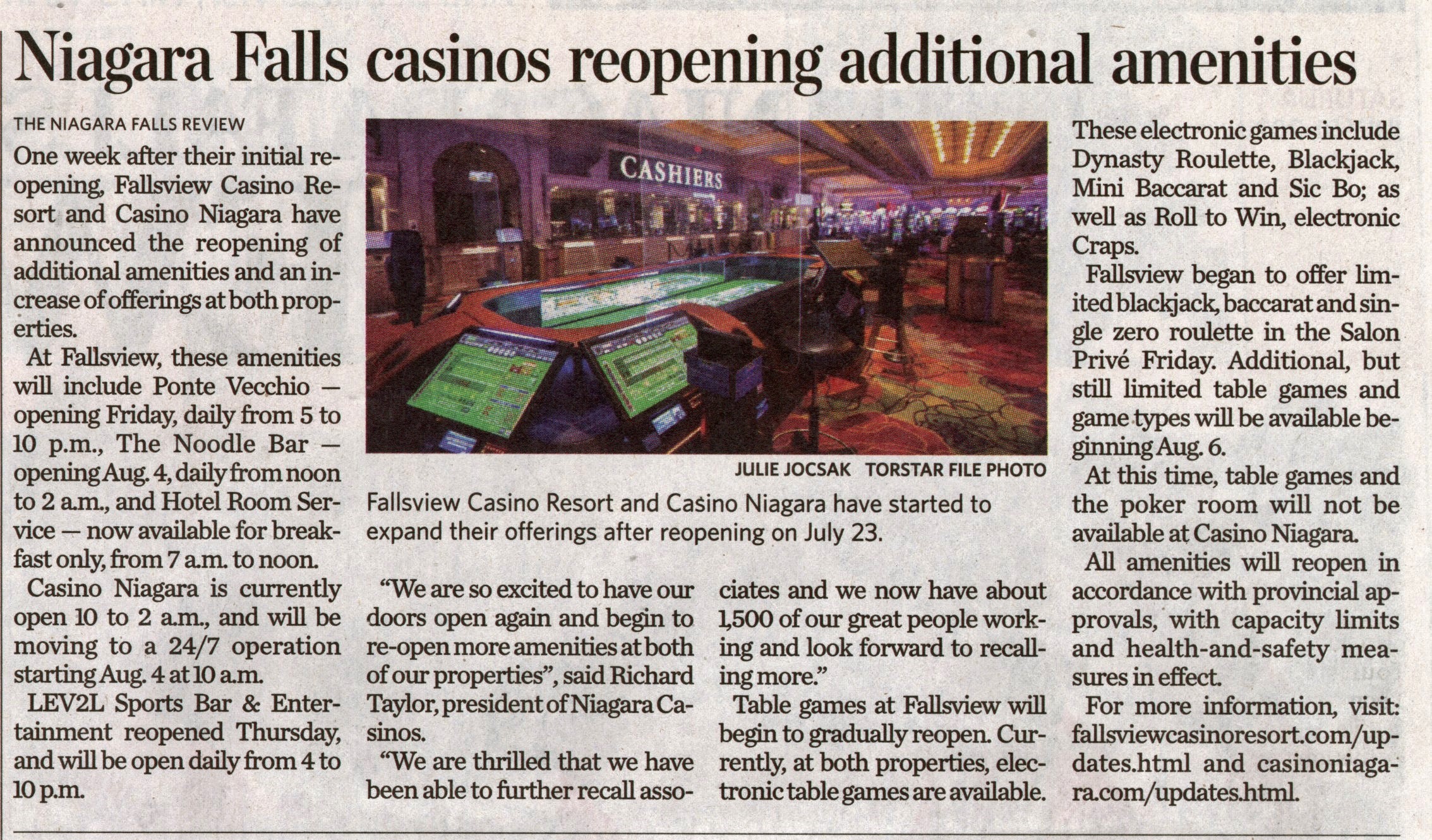 - Niagara Falls casinos reopening additional amenities