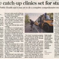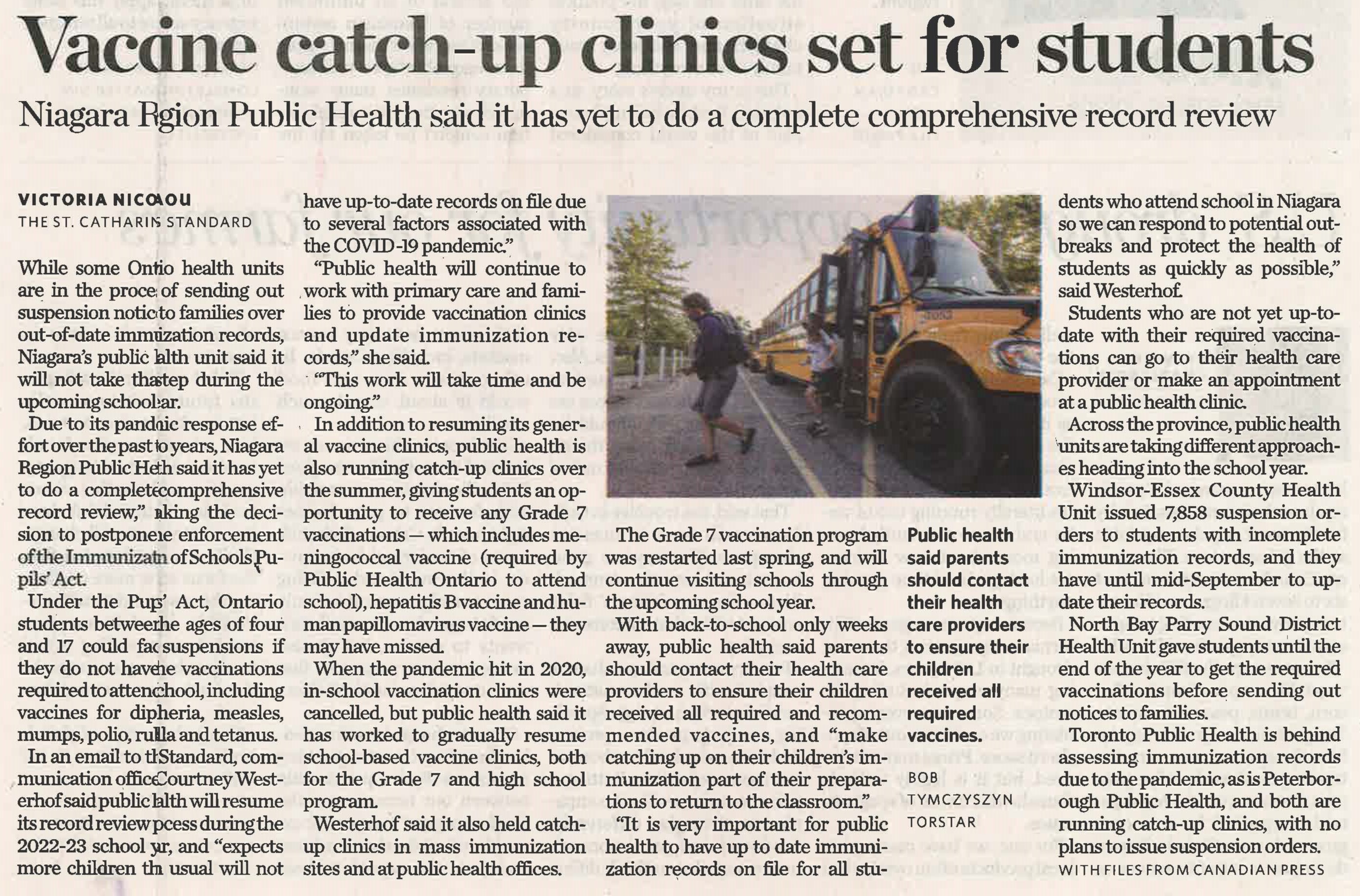- Vaccine catch-up clinics set for students : Niagara Region Public Health said it has yet to do a complete comprehensive record review