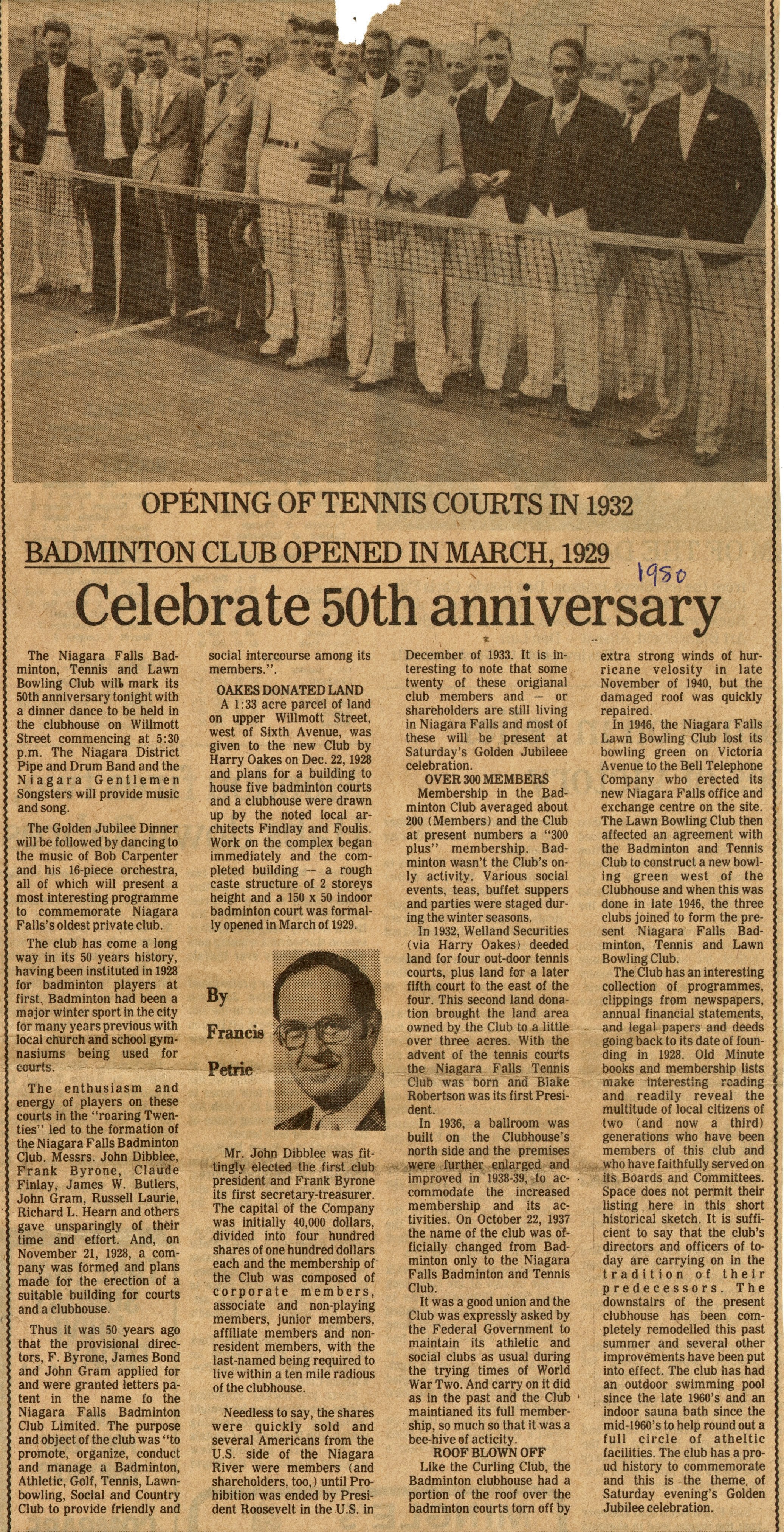 - Niagara Falls Badminton, Tennis and Lawn Bowling Club / 50th Anniversary / Byrone, F. / Bond, James / Gram, John / Oakes, Harry