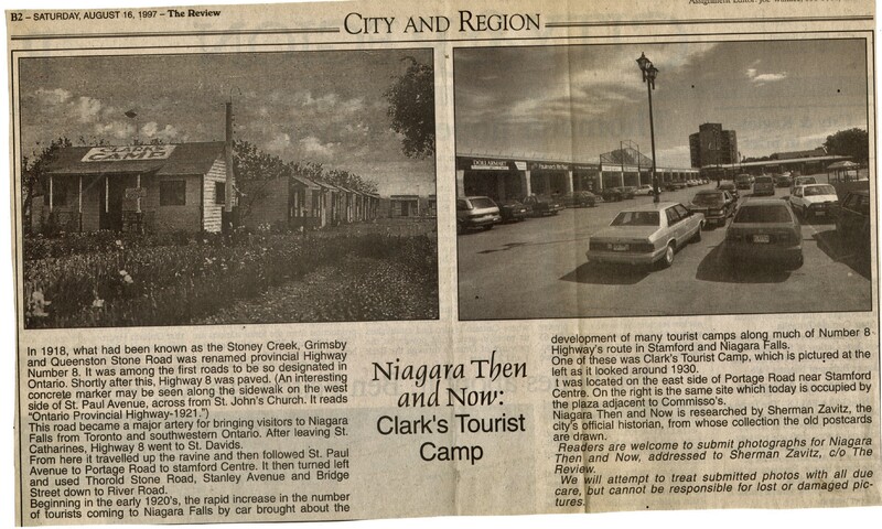 - Highway Number 8 / Stoney Creek / Grimsby / Queenston Stone Road / St. Paul Avenue / St. John's Church / tourist influx / Clark's Tourist Camp / Portage Road