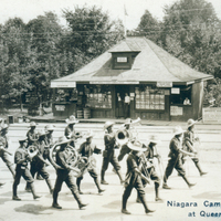 - A military band is shown marching in front of the Niagara Park & River railway Station at Queenston Heights ; bandsmen are marching four abreast and instruments they are carrying include trumpets and tubas ; some bandsmen are wearing traditional peaked military caps and other Australian type bush hats ;