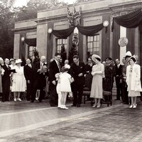- en-CA 1939 Royal Tour ; Hand written on back of photograph Visit of King George & Elizabeth to Niagara Falls. David Hanniwell and Eleanor Donald presenting flowers, Mayor Carl Hanniwell standing beside them.