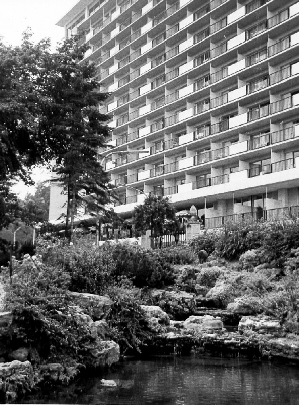 The Foxhead Hotel viewed from the West, Oakes Garden pool in foreground