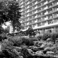 - The Foxhead Hotel viewed from the West, Oakes Garden pool in foreground