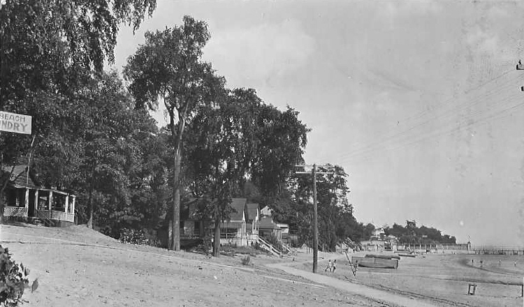 - en-CA View of the beach. Sign on building says Beach Laundry