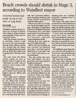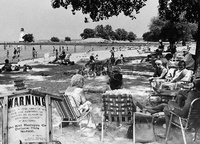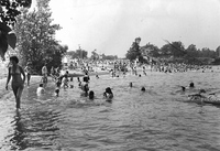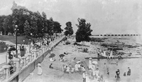 Long shot of the sand bathing beach at Port Dalhousie ; many swimmers are in the water whilst others paddle ; three wooden row boats are pulled up onto the sand ; two women in bathing costumes in foreground ; other women in the image are dressed in floor length dresses and are wearing hats ; some carry parasols ; wooden benches are along the water's edge ; Port Dalhousie light house in background centre right;