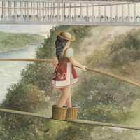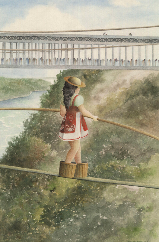 - Signorina Maria Spelterini with baskets on her feet whilst walking a rope over the Niagara Gorge