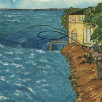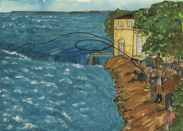 - The stranded scow lying in the Upper Rapids has been a fixture since August 6, 1918. It broke loose while being towed by the tug Hassayampa, after the tug went aground in the American Channel opposite Port Day, less than a mile above the Falls. ...a line was shot out from the top of the Toronto Power House. Attempts were made to rig a breeches buoy, but the lines became fouled and it was not until "Red Hill" volunteered his services that it was possible to bring the men to shore, excerpted from Niagara Falls, Canada : a history of the City and the world famous beauty spot ;