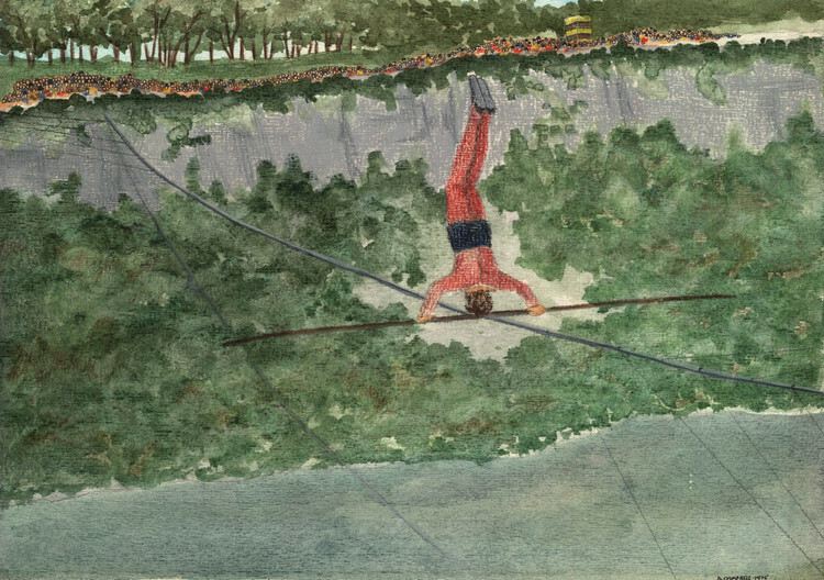 - en-CA Niagara Falls Heritage Foundation Government of Canada Local Initiatives Grant AK 2403-9 1974 - 1975 ; Artistic recreation based on a stereograph by Platt D Babbit held at the Earl W Brydges Public Library Niagara Falls NY ; Research by George Seibel ; "On Wednesday August 3rd 1859 Blondin, before the largest crowd of that year, mae a trip over the rope in less than six minutes, taking time to stand on his head. While an admission was charged at White's Pleasure Gardens, Blondin's principle source of of compensation was through collections taken up among the crowds on the River bank - excerpted from "Reference Anthology & Bibliography of Niagara Falls" by Dow, volume 1 page 387 ;