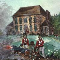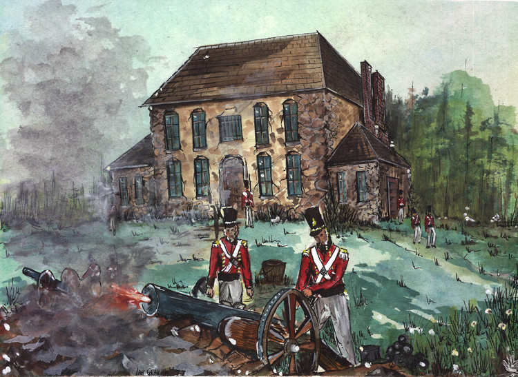 - Hamilton House, was located in the village of Queenston. The house was destroyed during an artillery exchange between British and United States trooops during the War of 1812 ; in this image they are using six-pound cannons ;