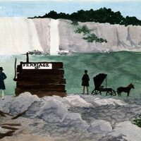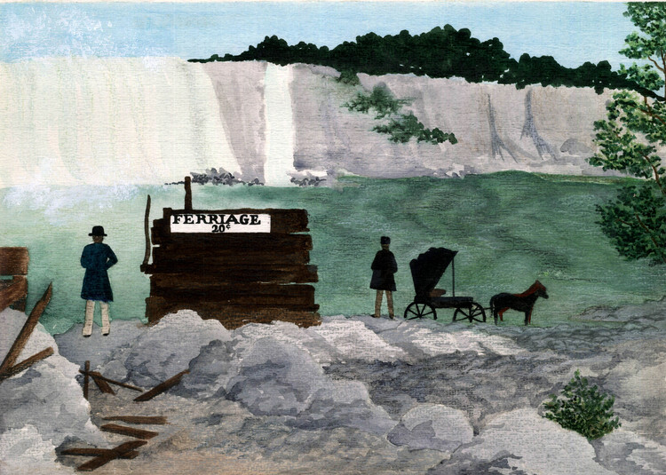 - en-CA Niagara Falls Heritage Foundation Government of Canada Local Initiatives Grant AK 2403-9 1974 - 1975 ; Artistic recreation courtesy "Niagara" by Ralph Greenhill and Thomas D. Mahoney ; Research by George Seibel ; While the second Maid of the Mist plied the waters of the Niagara River, the row boat ferries still operated. Passengers were carried across the River for 20 cents - after landing they had to get their own baggage up the cliff by means of the Incline Railway ;