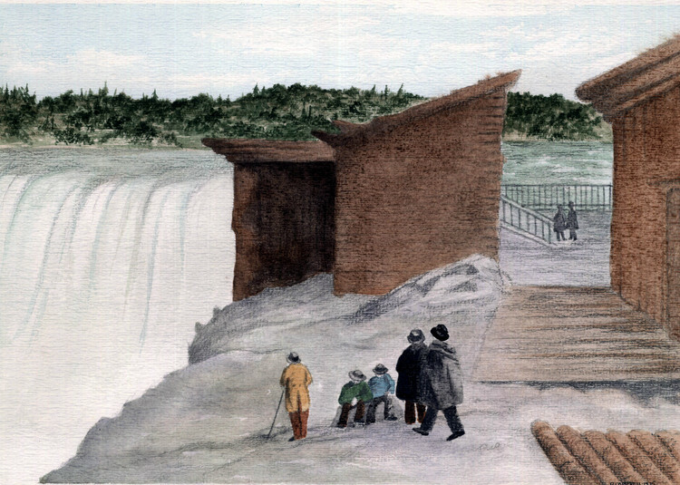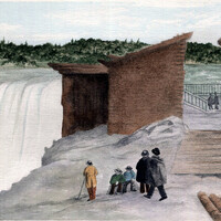 - en-CA Niagara Falls Heritage Foundation Government of Canada Local Initiatives Grant AK 2403-9 1974 - 1975 ; Artistic recreation from a sketch taken from an unknown publication ; Research by George Seibel ; "Frances Milton Trollope in "Domestic manners of Americans" published in London 1832, wrote about this shantee which contained the book of names of those who ventured behind the "Sheet of water". Certificates were given out to those who "had passed behind the great falling sheet of water". According to a certificate in Library and Archives Canada, Isaiah Starkey was the concessionaire in charge on the trip in 1838. At one time, according to Sir Richard Bonnycastle, writing inh the early 1840s, it was necessary to pass through a bar room at the top of the stairs on the way down the bank" excerpted from Niagara Falls Canada : A History page 261 ;