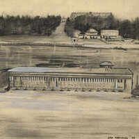 - Table Rock House (left), Murray Hill (centre), Lower Niagara River in foreground ;