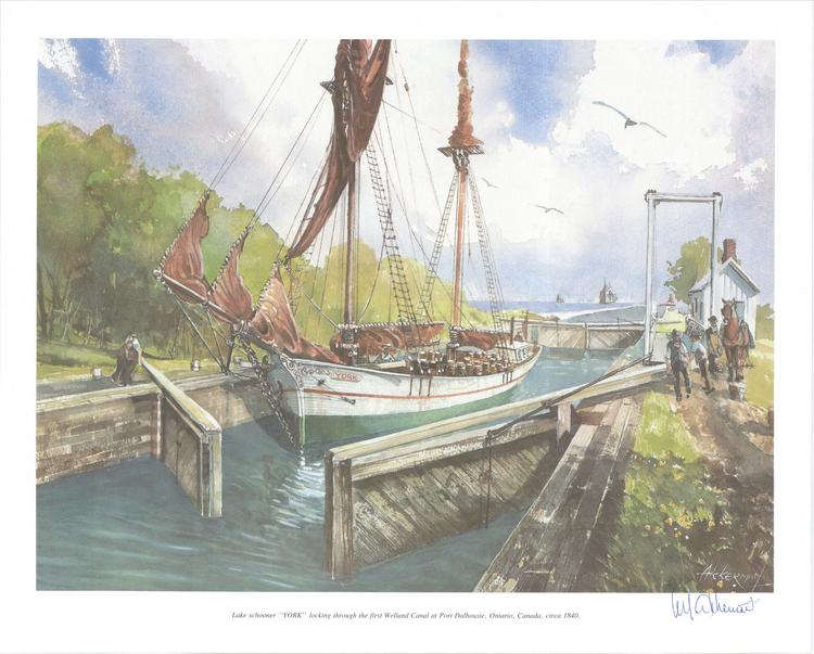- The "YORK" was a typical schooner that plied the Great Lakes carrying about 165 tons of supplies from Montreal or Toronto to settlements along the upper lakes. On the return trip, the schooners would carry grain, wood, or other raw materials. The original Welland Canal had 40 wooden locks, operated by lock-tenders. Tow-boys, driving teams of horses, would pull the vessels through the canal system. The first locks measured 22 feet wide by 110 feet long, considerably smaller than today's locks. In the right background sits the lock-tender's cabin.