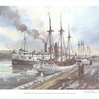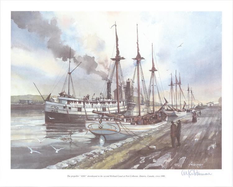 - Old meets new in Port Colborne harbour. These two lake vessels depict the transition period of the late 1800's, from schooners to 750 ton cargo capacity propellor steamers such as the "ASIA." Grain elevators and the Welland Railway tracks and cars, in the background, show Port Colborne's importance then, as a busy trans-shipment point. Since heavily loaded carriers would have scraped bottom in the shallow locks of the second Welland Canal, some cargo was unloaded and shipped by rail to the end of the canal. The "ASIA" was a combined package freighter and passenger steamer.