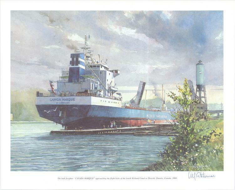 - "CANADA MARQUIS," a bulk freighter built in 1983 in Glasgow, Scotland for Misener Transportation of St. Catharines, Ontario, has a cargo capacity of about 25,000 tons. The huge carrier, entering Lock 4, is 730 feet long and squared off at the stern to maximize the amount of ship that can fit into the 80-foot by 800-foot long locks. In fact, the canal is officially named the Welland Ship Canal because it can handle ocean-going ships. The surge tank in the background is part of the St. Lawrence Seaway Welland Canal hydro generating station.