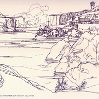 - Horseshoe Falls and the Maid of the Mist landing dock seen from the base of the Rainbow Bridge
