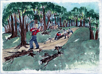 Cutting down trees and clearing to widen Portage Road Niagara Falls Heritage Foundation Government of Canada Local Initiatives Grant AK 2403-9 1974 - 1975 ; research by George Seibel ; When the portage was moved to the west side of the River, it was necessary to widen the road that had so far been followed by all the traffic between the "new landing" and the Chippawa, a route winding through the settlements and following the most suitable ground. On March 31st 1790, the first Commissioner for Roads for Nassau (as the area was then called) were appointed. They were John McNabb, Andrew Butler, Jacob Tenbroek, Charles Pettit, Robert Lotteridge, Robert Nelles, Gilbert Tice, John Warren, Elijah Phelps, Jacob Ball Jr., and John Powell - excerpted from The Niagara Portage Road by Ernest W Green ; -